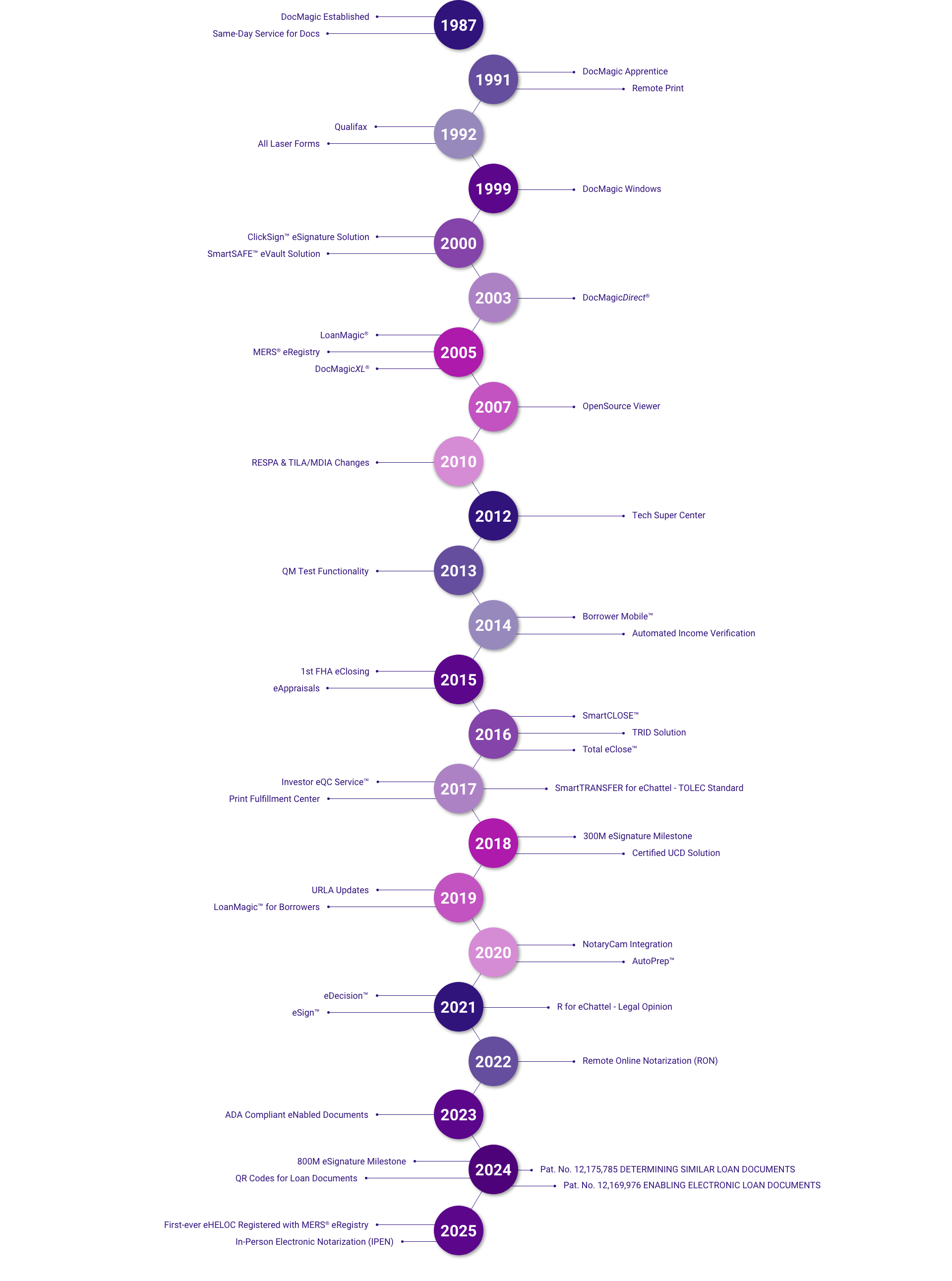 Founded in 1987, DocMagic has grown over the past 38 years to become a leading provider of document generation, automated compliance and digital transaction solutions for the national mortgage industry. Scroll through our timeline of innovation milestones to learn more about DocMagic's products and services.
